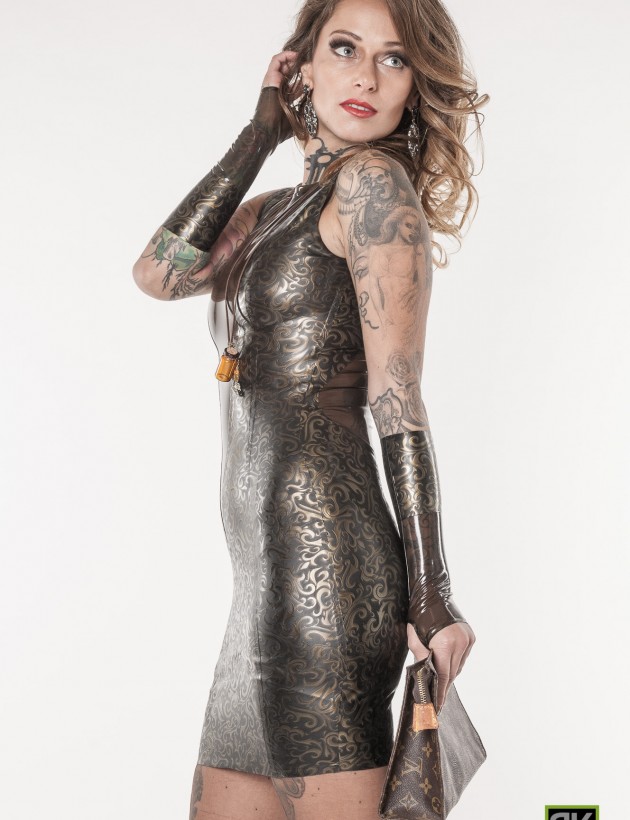 Die Kombination aus transparentem Latex und strukturiertem Latex verleiht dem Kleid eine geheimnisvolle Aura. Der transparente Latex sorgt für subtile Einblicke, während der strukturierte Latex durch seine Haptik und Optik die Fantasie anregt. Zusammen spielen diese Materialien geschickt mit Licht und Schatten und sorgen für einen Wow-Effekt, der sowohl elegant als auch verführerisch wirkt.