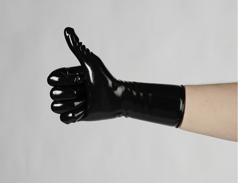 Glänzende, nicht chlorierte Latex-Kurz-Handschuhe von Fetisso – exklusiv bei rubberik. Der edle Rollrand verleiht dem Design einen klassischen, eleganten Look mit hochwertiger Ausstrahlung.